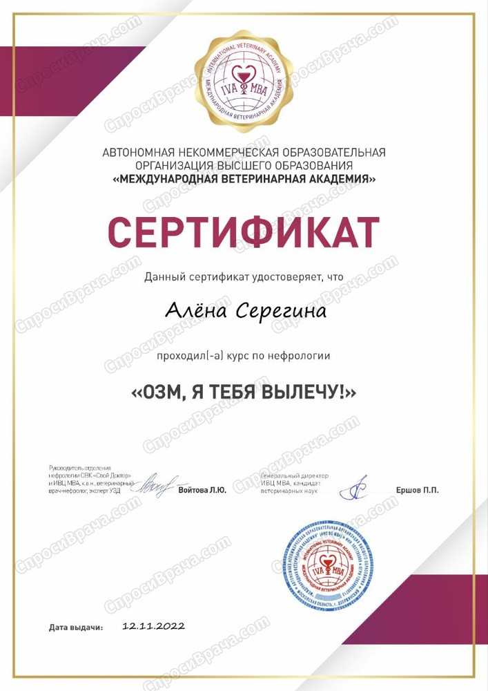 Консультация была очень информативной и полезной, обсудили лечение, которое предложил наш лечащий врач для животного в тяжёлом состоянии, дополнили, обсудили и дополнительные вопросы по питанию, рекомендации знакомых ветеринаров. Не ожидала такого структурированного и глубокого подхода. Алена Игоревна проанализировала все анализы и дала рекомендации, как двигаться дальше сейчас, когда нужны точки контроля и какие нужно будет сдать анализы, когда питомец выйдет из кризиса.