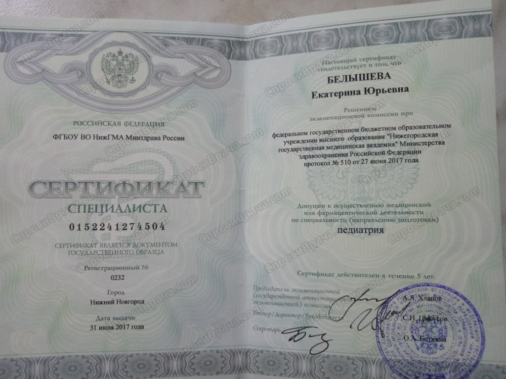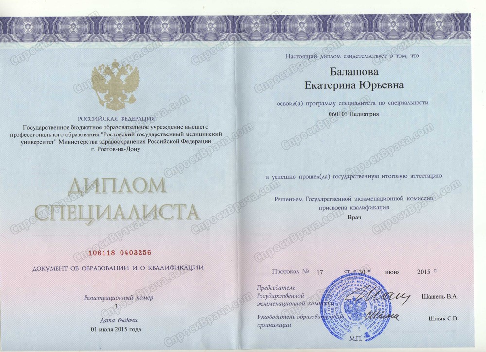 2009-2015,Ростовский государственный медицинский университет, педиатрический факультет,квалификация- врач.2016-2017 г. НижГМА интернатура по специальности педиатрия.