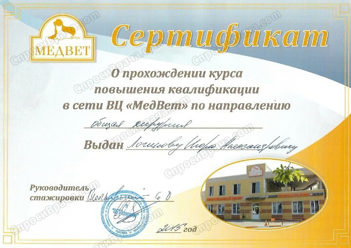 Стажировался в лучших клиниках страны, а именно Медвет (Москва)(хирургия) и клиника Доктора Сотникова (Санкт Петербург) направление УЗД и терапия.