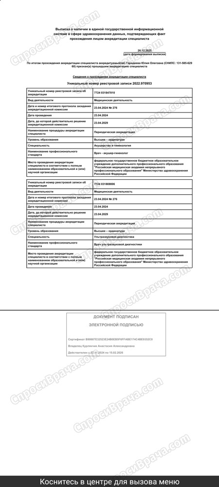 у беременных пациенток, так как в этом случае доктор отвечает не только за будущую мамочку,но и за малыша. Свой профессиональный путь я начала сразу как с амбулаторного приёма в женской консультации, так и с дежурств в роддоме и гинекологическом отделение. И по настоящее время работаю в том же графике, чтобы оказывать помощь не только плановым пациенткам амбулаторно, но и принимать взвешенные решения в экстренной ситуации, суметь быстро оказать необходимую помощь в экстренных условиях. Владею многими хирургическими манипуляциями: кесарево сечение, выскабливание матки, гистероскопия, биопсия шейки матки, пайппель-биопсия, установка и удаление ВМС, кольпоскопия. В своей практике использую методы обследования и лечения согласно клиническим рекомендациям. Являюсь врачом акушером-гинекологом первой квалификационной категории.