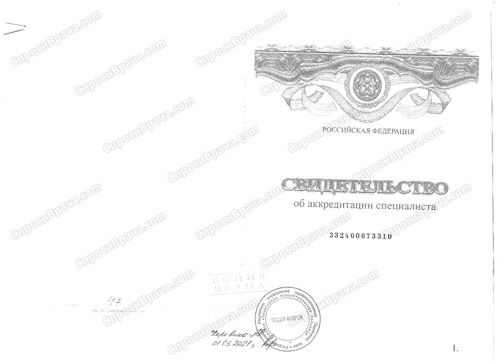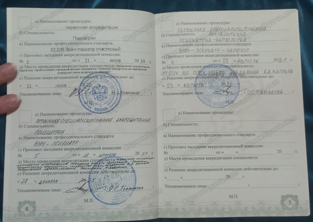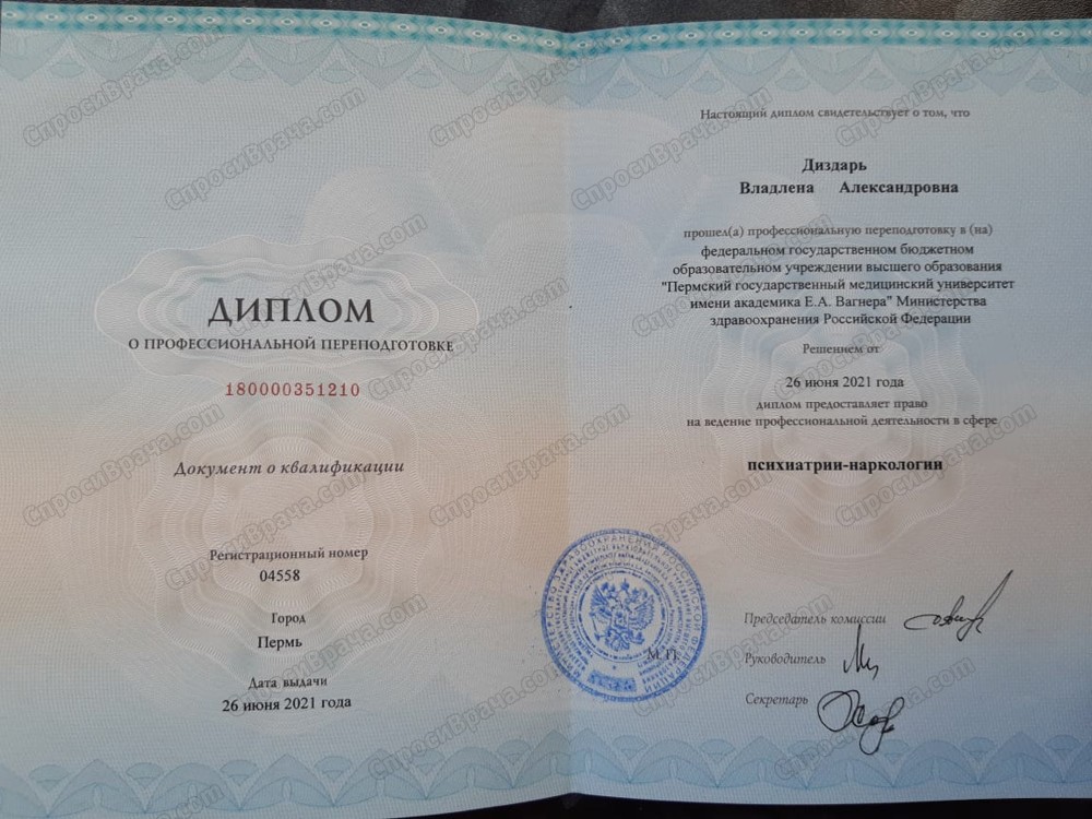 2021 год - профессиональная переподготовка по специальности "Психиатрия-наркология" на базе Кафедры психиатрии, наркологии и медицинской психологии г.Перми.