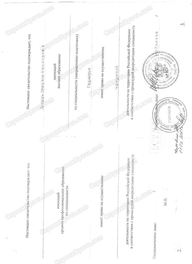 2012-2018, ПГМУ, высшее образование, врач-педиатр; 2018-2020, ПГМУ, "врач-психиатр", 2021, ПГМУ "врач психиатр-нарколог"