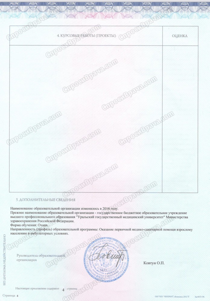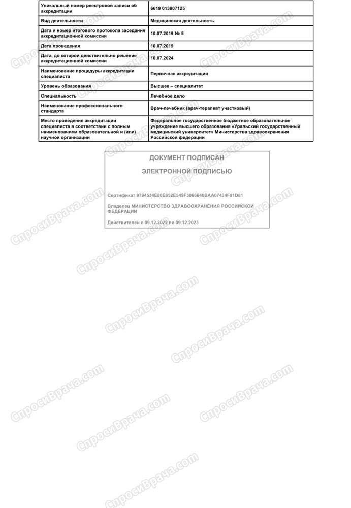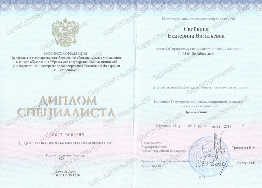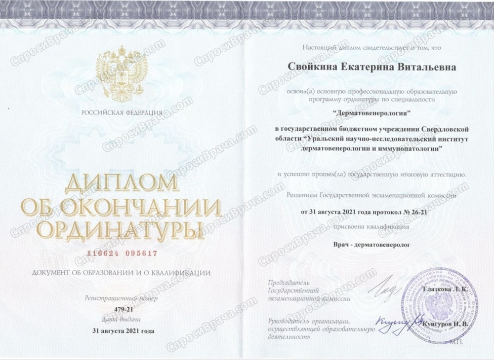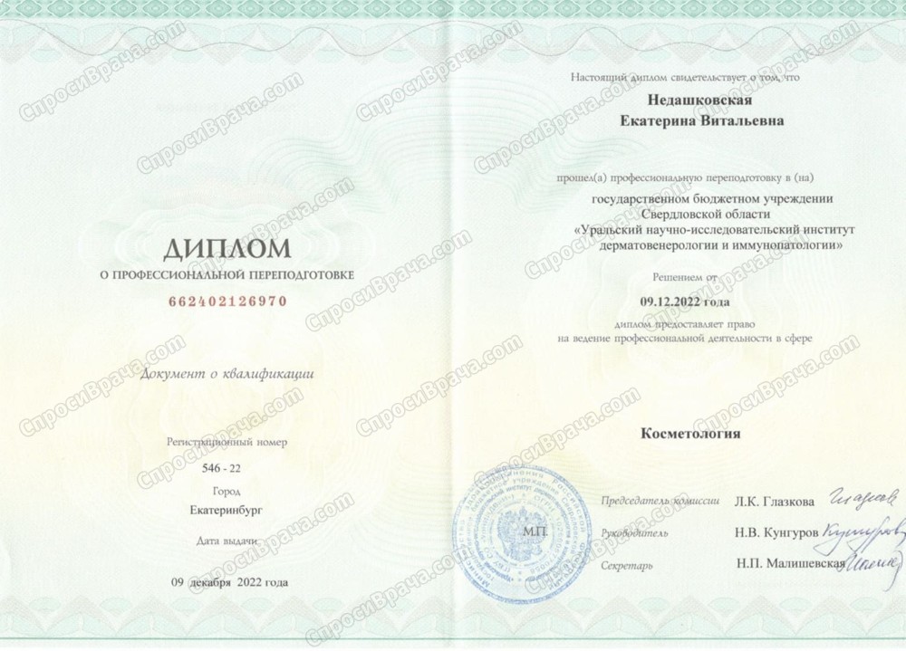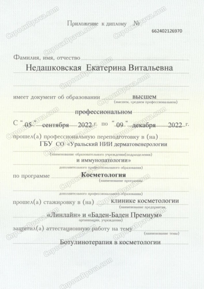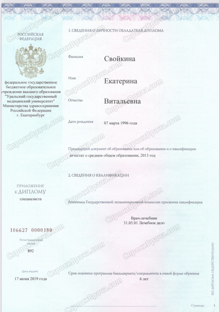 2013-2019, УГМУ, Лечебное дело, врач-лечебник. 2019-2021, УрНИИДВиИ, дерматовенерология, врач-дерматовенеролог. 2022, УрНИИДВиИ, косметология, врач-косметолог.
