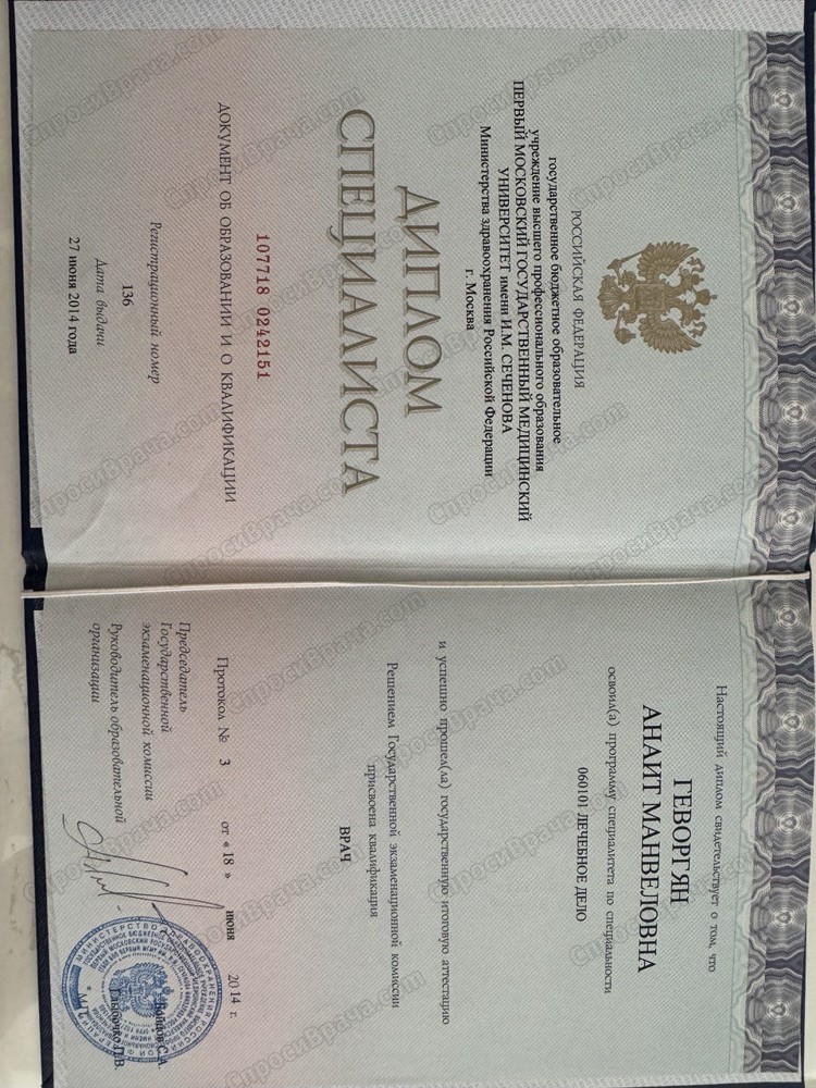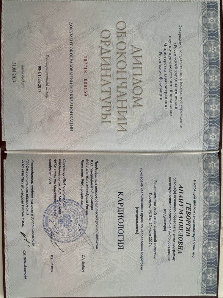 Выпускник 2014 года лечебного факультета факультета (Первый МГМУ им И.М. Сеченова) по специальности «Лечебное дело». Прошла обучение в интернатуре по терапии с 2014 по 2015гг., далее обучение в ординатуре по кардиологии С 2015 ПО 2017гг. (РКНПК им Л.А. Мясникова, в н.вр. НМИЦ кардиологии Е.И. Чазова) . Обладаю глубокими знаниями в области диагностики и лечения сердечно-сосудистых заболеваний. Внимательна к деталям, ответственная. Стремлюсь к профессиональному развитию и освоению новых методов лечения.