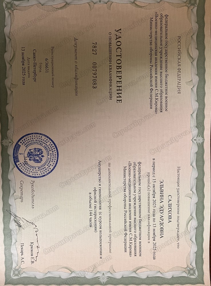 прошла обучение по темам «Артериальная гипертония у беременных", "Доброкачественные заболевания молочных желез", "Постменопаузальный остеопороз", "Синдром поликистозных яичников (гиперандрогения)", "Аномальные маточные кровотечения пубертатного периода", "Правила подбора комбинированных оральных контрацептивов", "Миома матки", "Генитоуринарный синдром в менопаузе", "Современные методы прерывания нежелательной беременности".
