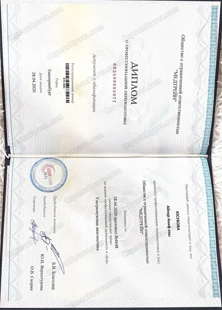 2020 - Первичная переподготовка по специальности "Ультразвуковая диагностика", на базе центра профессионального образования врачей "МедТрейн"