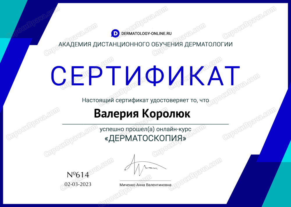 Меня зовут Валерия Валерьевна, я врач-дерматовенеролог. На данный момент работаю в кожно-венерологическом диспансере, занимаюсь диагностикой и лечением заболеваний кожи, волос, ногтей, венерических заболеваний, кожных новообразований. Буду рада любым вопросам, с радостью постараюсь вам помочь!