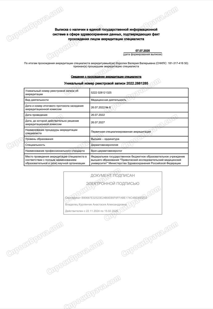 С 2013 по 2019 г. училась в ПИМУ г.Нижний Новгород по специал ности "Лечебное дело", затем в течение 1 года работала врачом терапевтом-участковым в городской поликлинике, после чего с 2020 по 2022 г. проходила ординатуру в ЛГМУ им. Святителя Луки, г. Луганск по специальности дерматовенерология. Так же окончила курс дерматоскопии. С 2022 г работаю в должности врача-дерматовенеролога в ГБУЗ НО НОКВД, г. Нижний Новгород