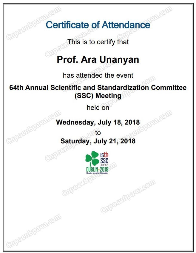 2018 г. Курс научного и стандартизационного комитета (SSC) международного общества по тромбозу и гемостазу (ISTH), Ирландия, Дублин