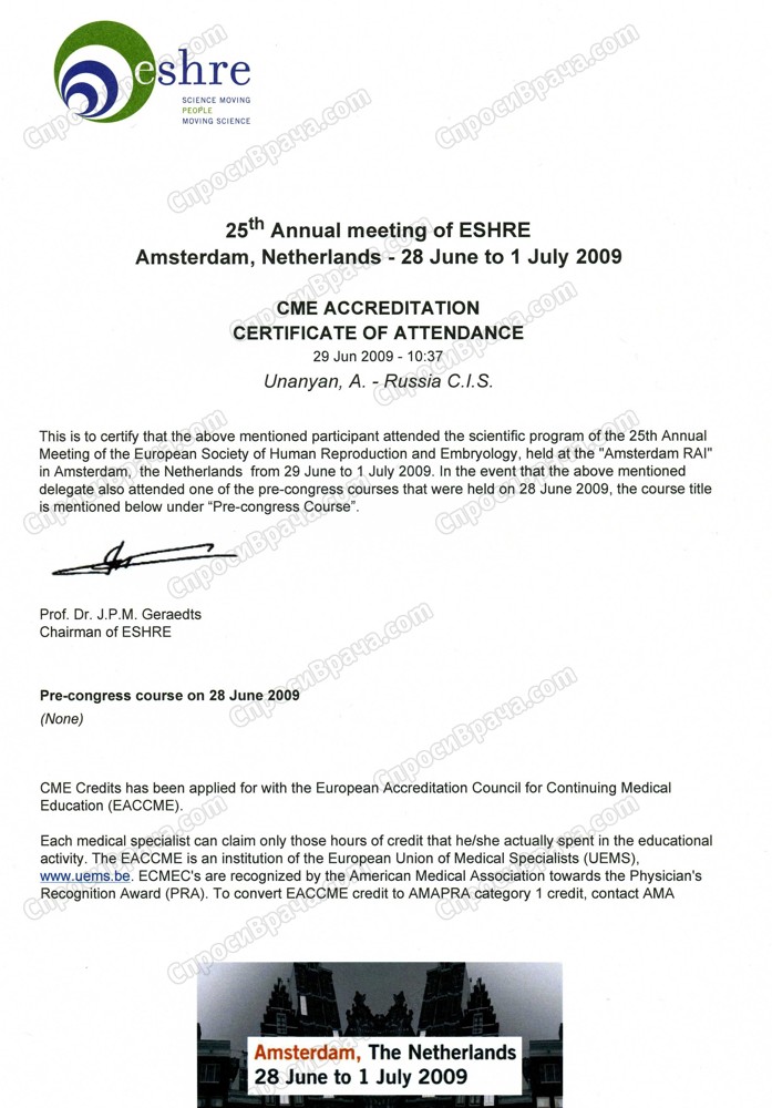 2009 г. Образовательный семинар Европейской ассоциации по репродукции, ESHRE, Нидерланды, Амстердам
