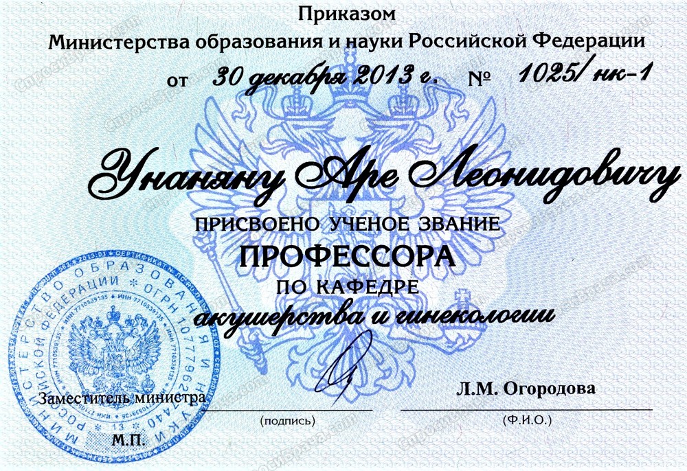 • Ученое звание профессора по кафедре акушерства и гинекологии (ВАК России)