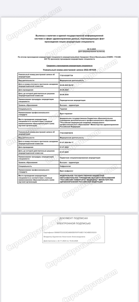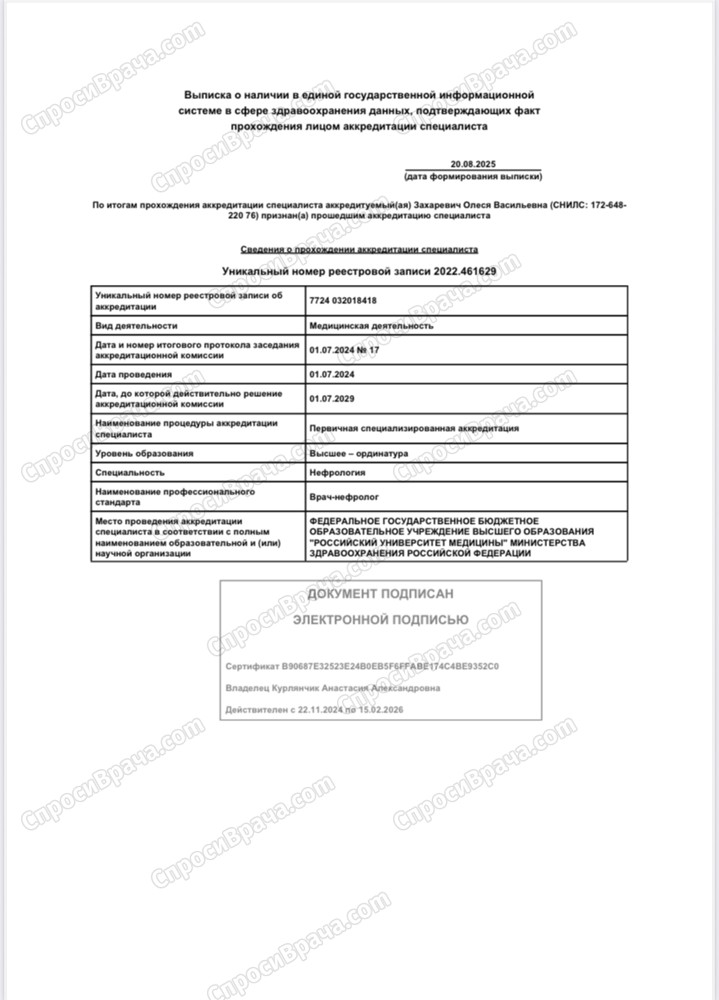 Меня зовут Захаревич Олеся Васильевна и я врач из г. Брянск, имеющий две специализации: терапия и нефрология. Свой профессиональный путь я начала в 2012 году с работы врачом в терапевтическом отделении Брянской Центральной районной Больницы. Проработав 10 лет терапевтом, я решила расширить свои познания в медицине и в 2023 году прошла обучение по специальности "Нефрология". В настоящее время веду амбулаторный приём в Медицинском центре "Мой доктор" по обеим своим специальностям. В своей работе я придерживаюсь принципов доказательной медицины, учитывая индивидуальные особенности каждого пациента, когда стандартный подход может быть неприменим. Моя философия:лечить не болезнь а больного. Владея большим объёмом знаний, помогу составить грамотный план обследований, разобраться с анализами и подобрать схему лечения.