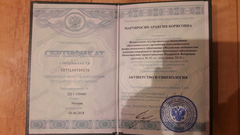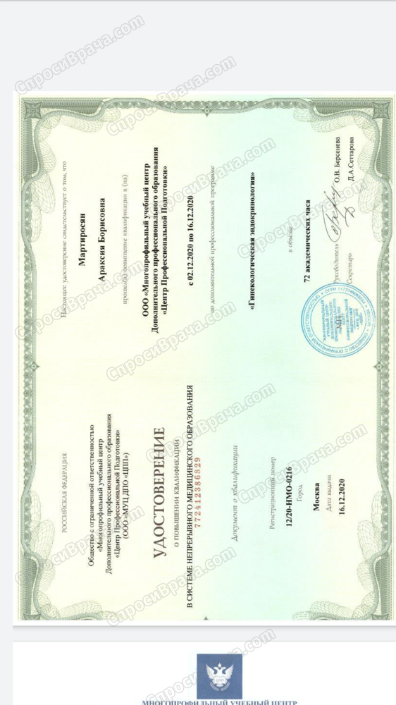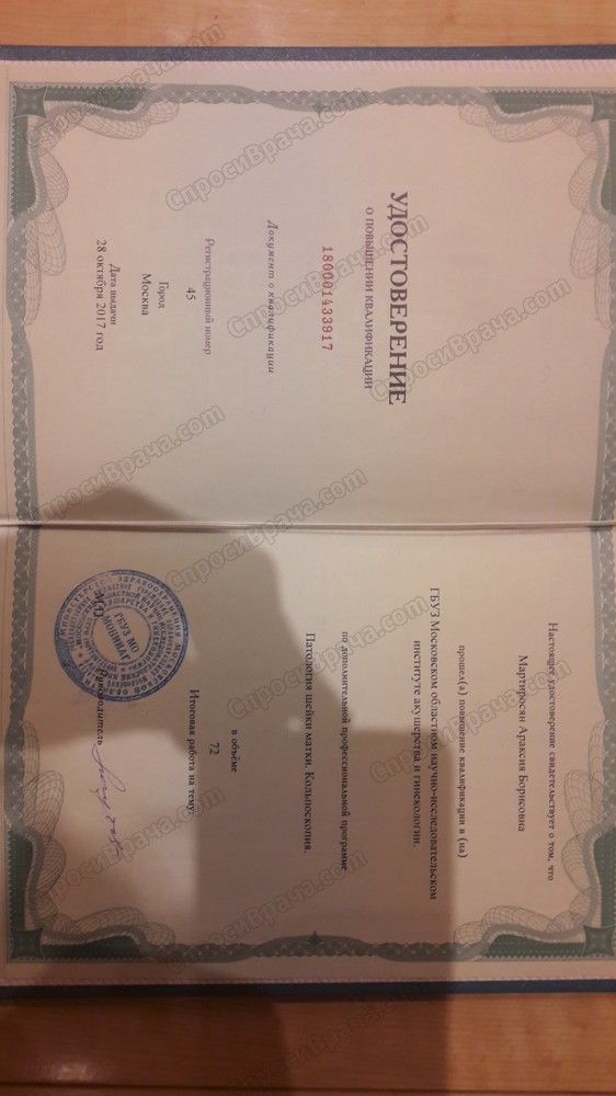 Сертификаты по разным направлениям в акушерстве и гинекологии. Усовершенствование по кольпоскопии и патологии шейки матки, гинекологической эндокринологии.