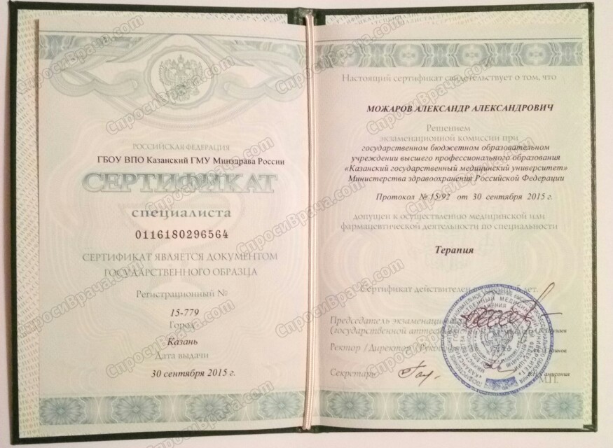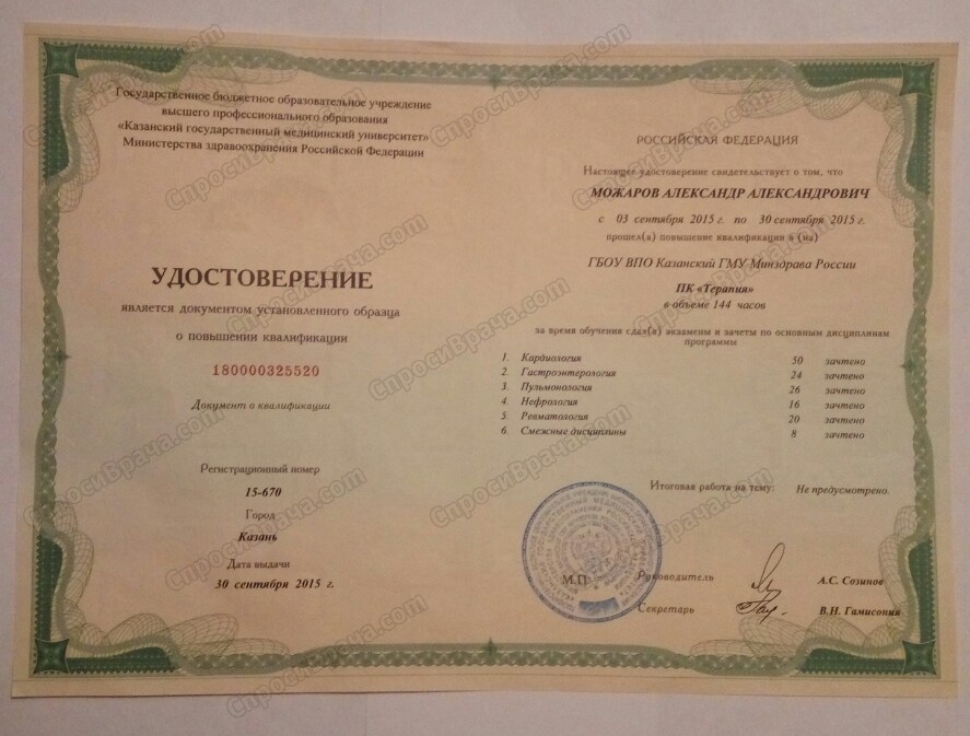 "ГБОУ ВПО Казанский ГМУ Минздрав России" 144 часов 2015г, ГАУ ДПО "Институт усовершенствования врачей"Минздрав Чувашии с 16 октября 2019 по 22 октября 2019г "Вопросы гериатрии в работе врача первичного звена здравоохранения"