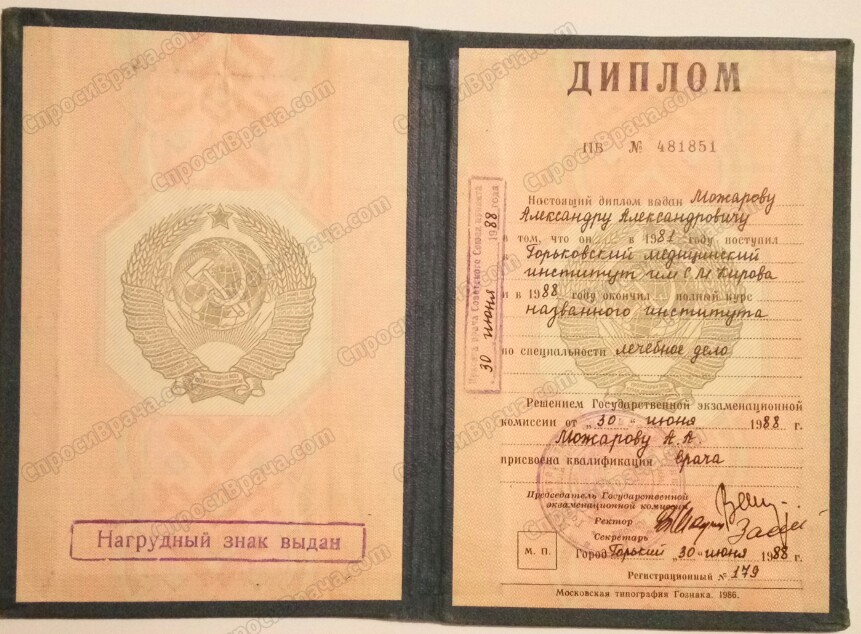 1981-1988гг.Горьковский медицинский институт им.С.М.Кирова , лечебное дело, терапия