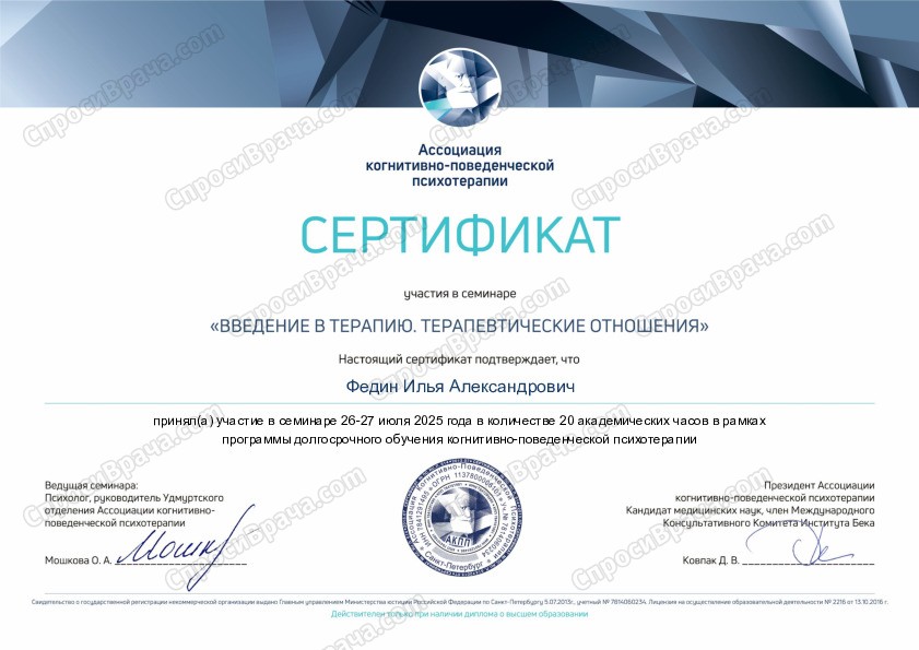 Я считаю, что пациент является полноправным участником терапевтического процесса. Он имеет право знать и понимать все аспекты своей проблемы и способы её решения, а также делиться своими мыслями и идеями о том, как можно её преодолеть. Я уверен, что активность пациента, его вопросы, комментарии и предложения являются важнейшими условиями для достижения успеха.