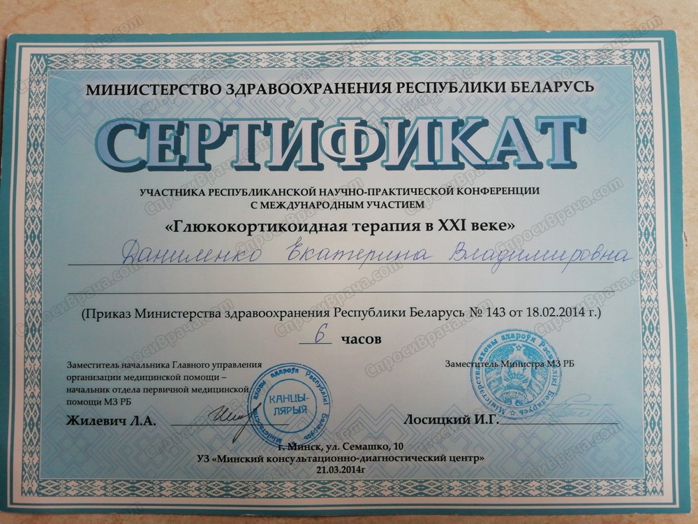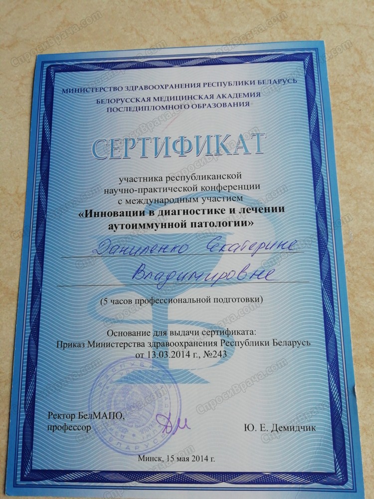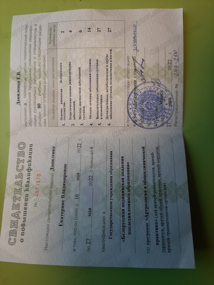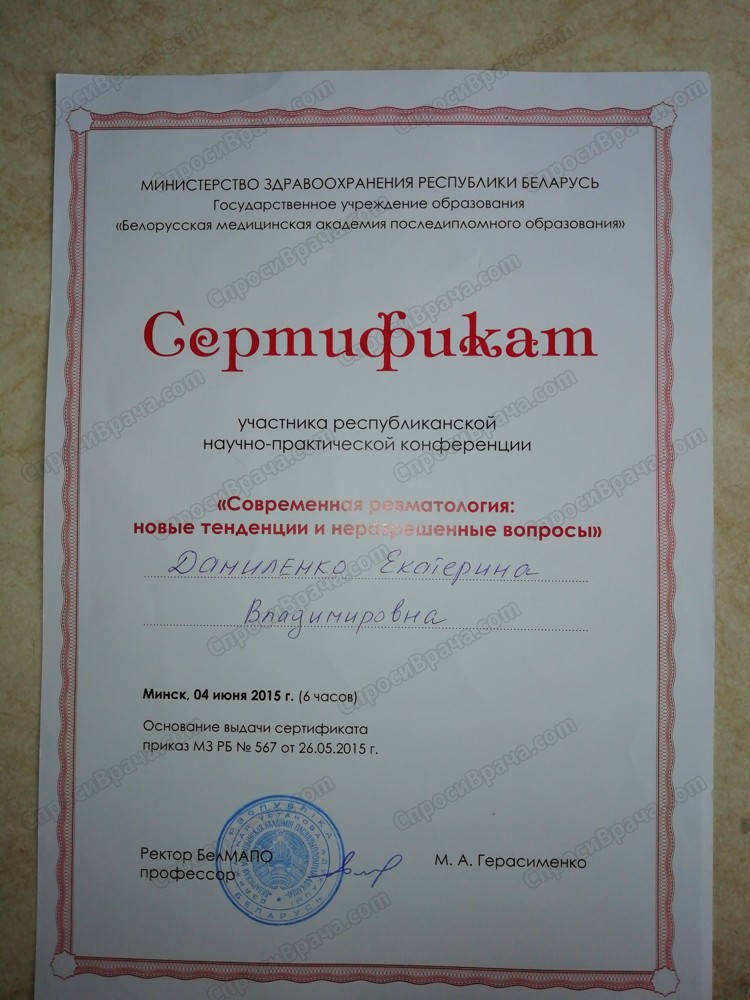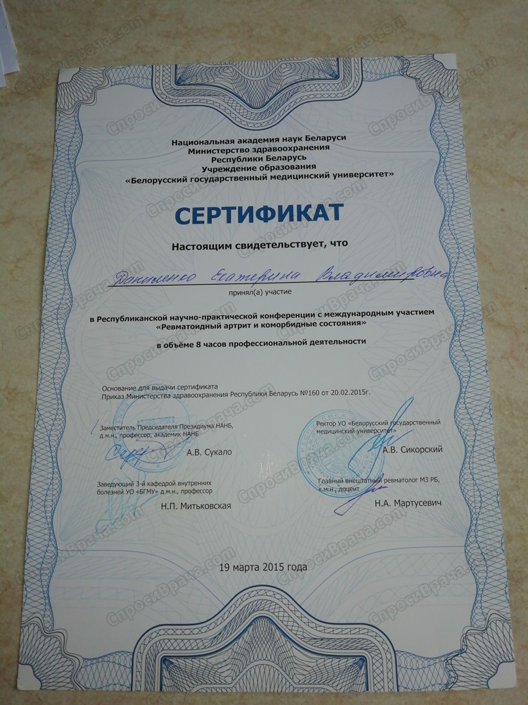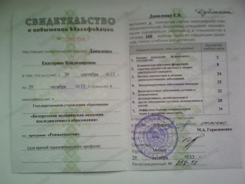 2006г, Витебский ГосударственныйМедицинский Университет, лечебно-профилактический факультет, врач-лечебник, ревматолог